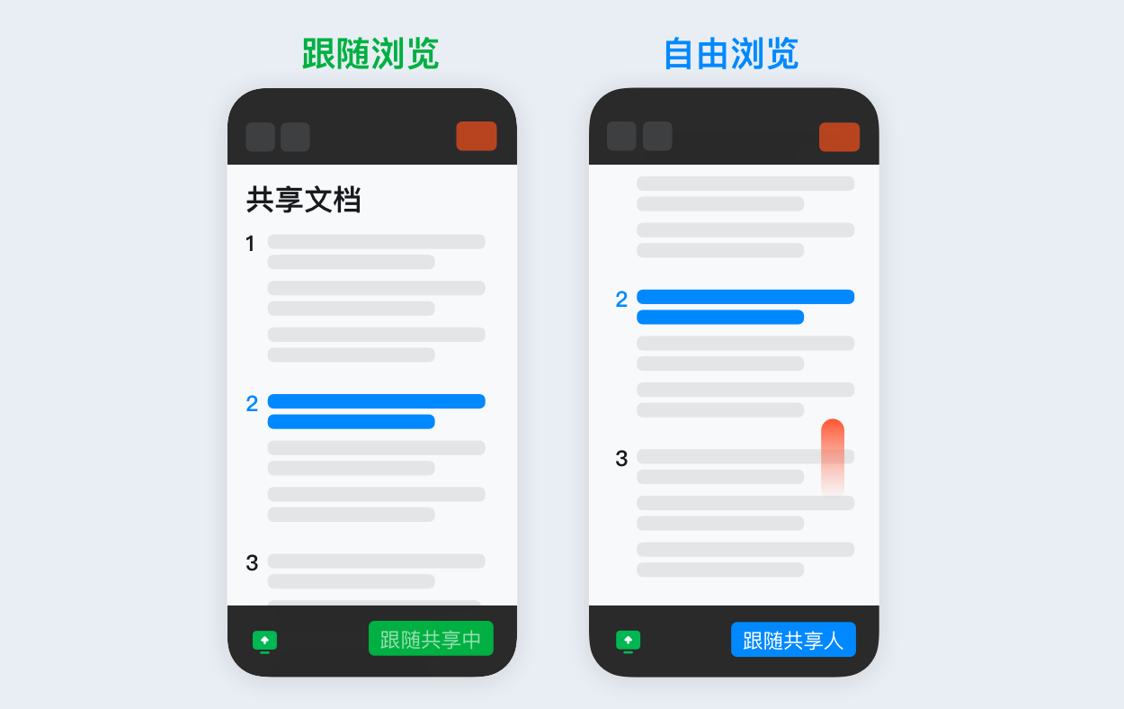 會中共享文檔,參會人可選擇跟隨主持人,也可以選擇自由瀏覽
