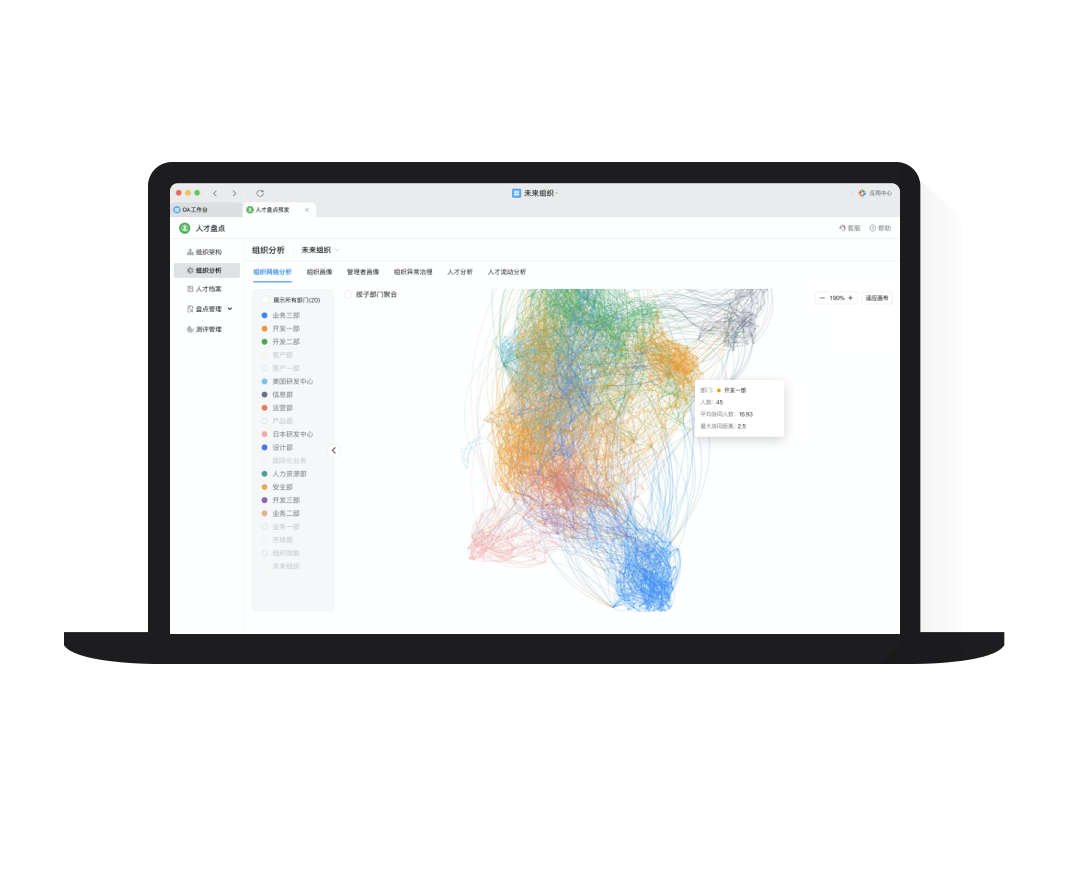 組織分析通過大數據智能分析,刻畫組織和人才畫像,描繪組織溝通網絡行為,幫助看清組織現狀,并跟蹤治理核心指標。